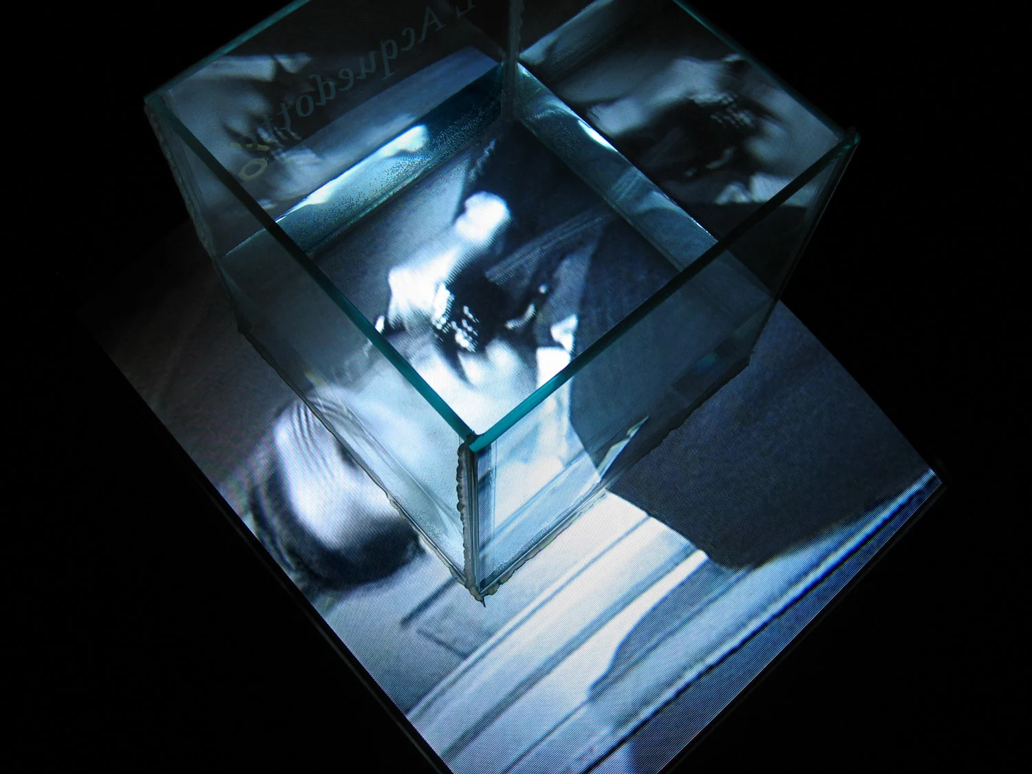 This image series looks at our relationship to the media screen, and how stories both reflect and influence the cultural landscape. The Maltese Falcon is a narrative that crosses centuries and cultures, includes deceit and murder, yet still manages to project an edgy Western morality. The film is projected into a video monitor, and refracted and reflected in a glass tank partially filled with water. In the tank, the players are broken into a kaleidoscope of planes, re-contextualizing both the imagery and the content. At a climactic point in the film, the characters are reflected in a jar of cow eyeballs and formaldehyde, presenting a dark, existential conundrum.
